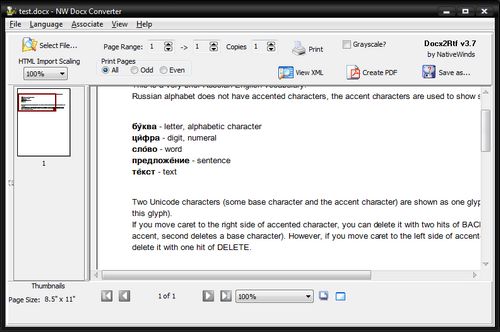 The NW Docx Converter -" Docx2Rtf" is a freeware file converter for MS Word 2007 (*.docx, *.dotx) and OpenOffice (*.sxw, *.odt) files. You do not need OpenOffice or Office 2007 to be installed for the program to work. Word 2007 docx files and OpenOffice files will be converted with partial formatting. Docx2Rtf will also open, view and print: Html, PDF and Rtf files, MS Works (*.wps) and documents stored in PalmOS Database (*.pdb) and Aportis (*.prc) formats. The latest version of Docx2Rtf adds graphics to the list of files that can be viewed, including multi-page tiff files. Now has the ability to extract plain text from standard Word doc files.