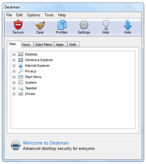 A powerful desktop security tool for home users and system administrators alike. System administrators require an effective tool to stop users from messing up the desktop, or apply tight security measures. Protect your system when you are away. Home users need a simple way of protecting their computers on coffee breaks, or restraining access to their desktop on shared computer environments. Deskman enables you to control and protect your desktop in a snap. Combining a selected array of options, users can customize different levels of security easily. You decide the restrictions to be applied and enforced.