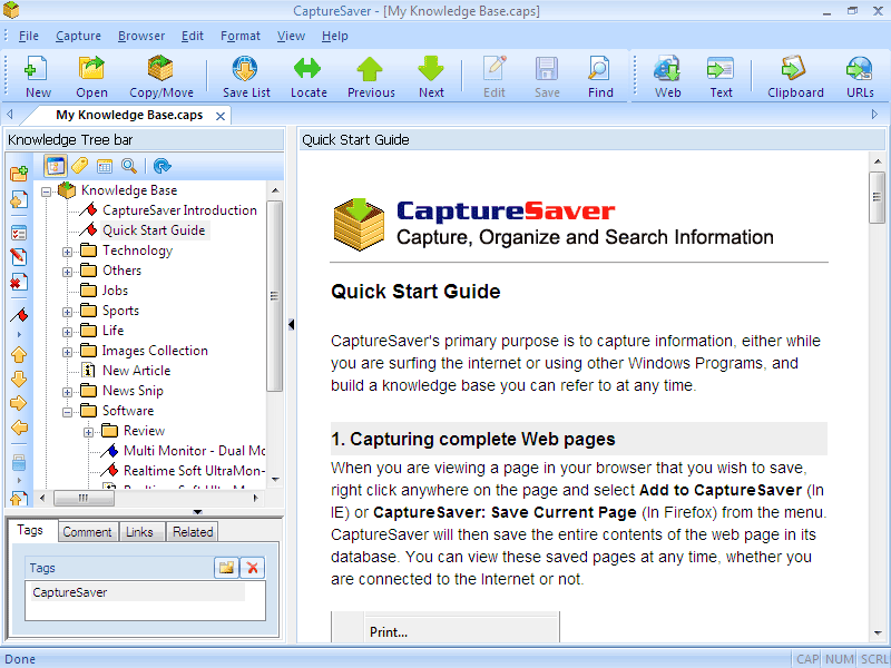 Everyone who surfs the Net comes across information they need to keep. With CaptureSaver you can permanently save selected text, images, and complete Web pages, then edit, mark, organize, and search for information in your offline personal and portable knowledge base. CaptureSaver also lets you save content from other applications such as MS Word and PDF files.