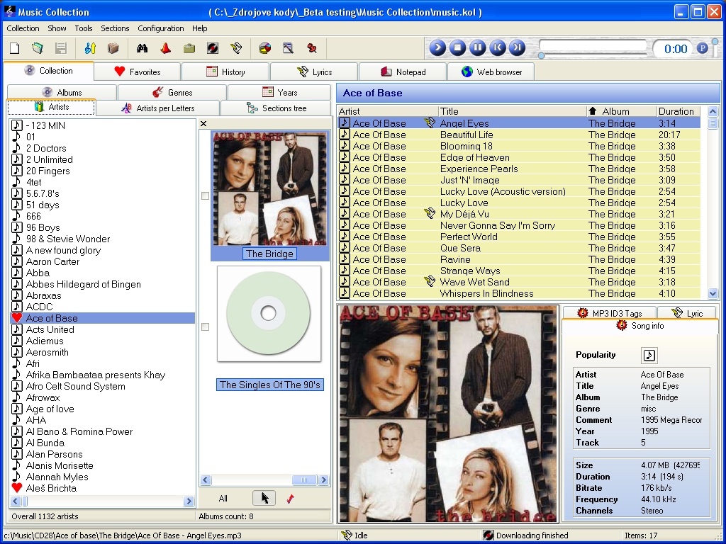 Program is able to easy manage and play large collections of music files. It shows songs in tree structure, sorted by artist, or album. Allows searching, creating categories of songs, exporting datas to TXT, DIF, HTML file or creating playlists. It support ID3 Tags version 1 and 2 and contains simple ID3 tag editor. Shows your favorites songs, song lyrics stored in the disk and contains small notepad too. It recognize diacritic marks. Program also contain utiliy to simple creating language mutations without edting language files. Album cover picture downloading possible from Amazon. Lyrics searching and downloading. Playing with internal or external player.