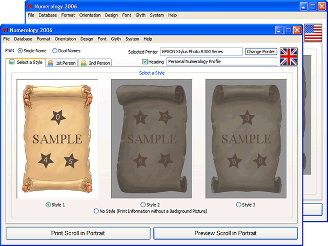Numerology 2008, print high quality scrolls and greeting cards based upon any name and birth date, choose from many different scroll and greeting card designs to produce the perfect gift for friends & family. * Easy to use Interface * Additional designs including Olde (3 NEW COLOUR DESIGNS) can be downloaded from our website from within the software * Additional formats including Keyrings, Fridge Magnets, Mugs etc. can be downloaded from our website from within the software * Supports British and American spellings * Supports any name and birth date * Free Product Updates for LIFE!