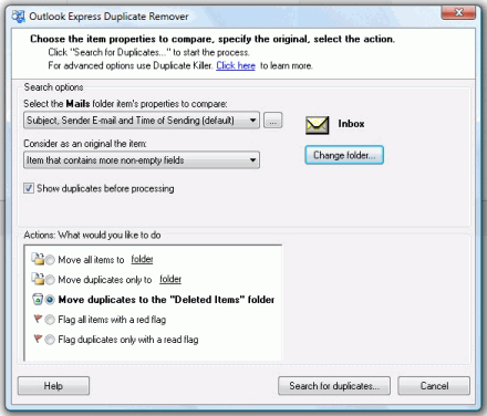 Duplicate Remover plug-in for Outlook Express, Windows Mail and Address Book is for simple search and elimination of email and contacts duplicates. In one step the program will automatically processes (eliminates, moves to a folder, mark with the flag or deletes) duplicates of contacts and e-mails messages. You can customize the way how the program recognizes duplicates. There is no complicated wizards. The program comes with a lifetime license with one year of free support, updates, and upgrades. Support for Windows Vista.
