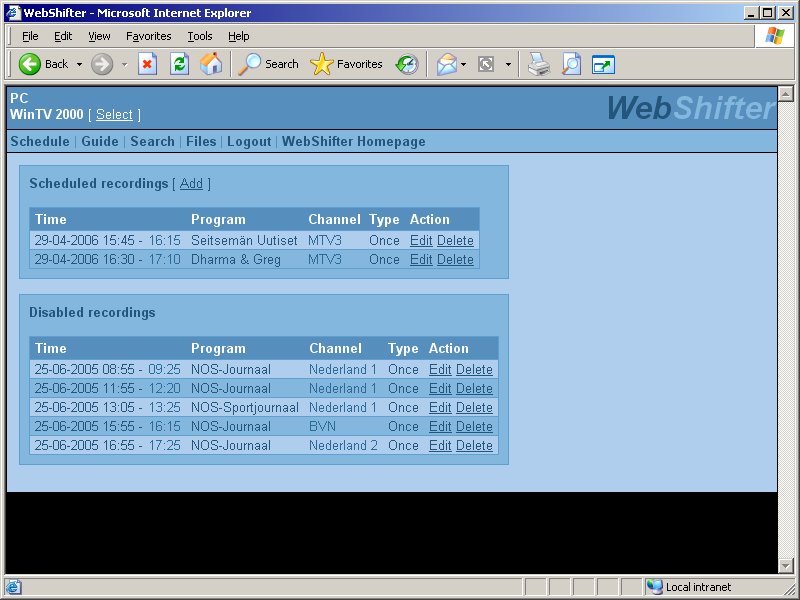 WebShifter is a web based and WAP enabled scheduler for analog, digital and satellite TV recording with integrated EPG and filemanager. It allows you to manage your TV recordings using a web browser on any PC or mobile device, at home or anywhere in the world.