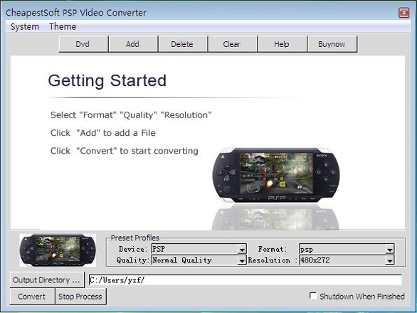 CheapestSoft PSP Video Converter converts almost all PC video files(including RM,RMVB,AVI, ASF, WMV, MOV, MPG, MPEG, AVC, OGG, MP4, DivX, FLV (Youtube), IFO, MP3, WMA, WAV, AAC and more) to sony PSP formats, for best quality of audio and video output for your PSP.Support DVD ripping.
