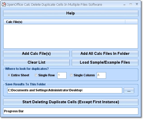 This software offers a solution to users who want to remove duplicate cells from multiple sheets in one or more Open Office Calc files. The user can specify a list of files or an entire folder to be processed. There are options to search for duplicates in a single row, single column or the entire sheet. Calc 2.0 or higher required.