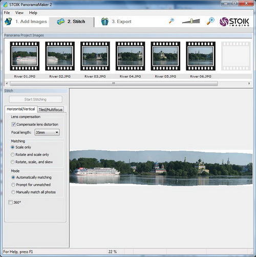 STOIK PanoramaMaker is automatic photo panorama software that turns any group of overlapping photos into high quality panoramic image. The program combines very simple user interface, step by step workflow and powerful modern mathematical approach to image matching.