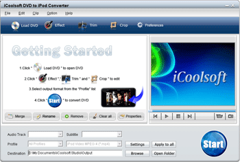 Besides the direct DVD to iPod video converting, iCoolsoft DVD to iPod Converter also provides rich converting settings and powerful editing functions, that help you customize the iPod video quality and edit DVD movies as you like. With the intuitive interface of iCoolsoft DVD to iPod Converter, you can easily finish the editing and converting with fast speed and high output quality.