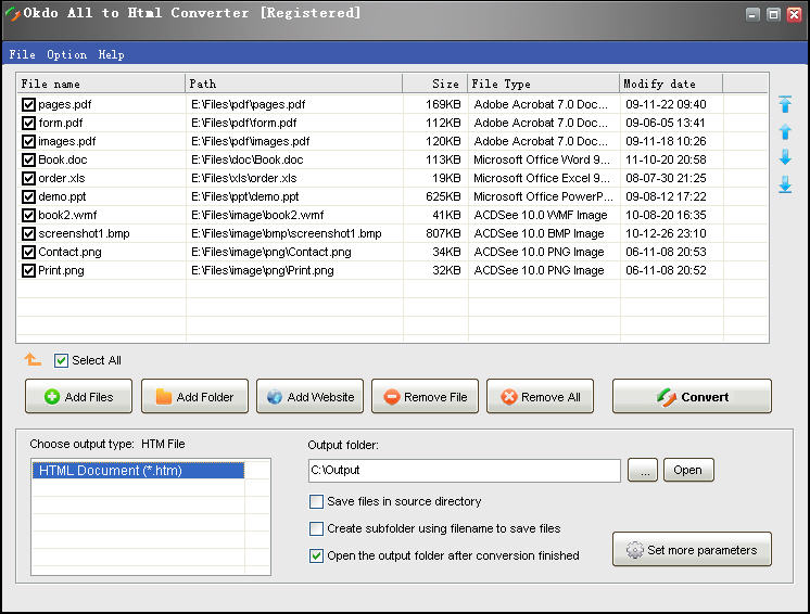 Okdo All to Html Converter is the easiest and powerful document to htm converter. You can batch convert different document formats including doc, docx, docm, xls, xlsx,xlsm,ppt,pptx,pptm,pdf,rtf,txt,gif,tif,jpg,bmp,png,wmf,emf to htm with ease. It can preserve original layout, text, images etc of your file. The program can convert with high output quality and very fast speed. It provides a professional and easy interface.
