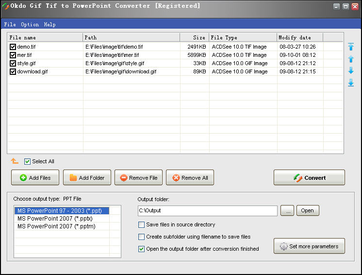 Okdo Gif Tif to PowerPoint Converter is a powerful and easy-to-use PowerPoint converter. Own the most powerful conversion function. you can batch convert gif/tif to ppt/pptx/pptm with ease. The program can convert with high output quality and very fast speed. It is easy to use whether you are a veteran or a beginner. you can play and view your gif/tif image with powerpoint.