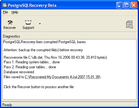 Recovery for PostgreSQL is data recovery program for PostgreSQL databases and saves retrieved data into an SQL script. Supports PostgreSQL version 8.2. Recovery for PostgreSQL restores table structure and data. Easy to use, no special user skills required. Supports ASCII encoding only
