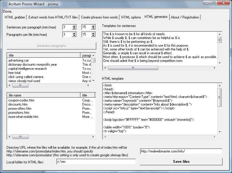 Have you ever wondered why the websites of your competitors are usually above your website in search results, when you use google, yahoo or msn search? Yeah, there are some tricks to get your website above others. Your competitors already learned some of these tricks while you are just to find them out right now. The thing that makes one page better than the others is called "page rank". Every search engine uses its own algorithm to calculate page ranks of various websites, but they all take into consideration what content the page provides to users. So, let's put all other issues aside and create a lot of good content with the help of our Acritum Promo Wizard software. Contrary to classic doorway generators that create stupid pages with keyphrases only and don't give any noticeable result because search engines recognize such pages easily and ingnore them later, we will create pseudo human-made pages that will be considered by search engines as really worthy pages. Our software was used by many webmasters and tested in Webmaster Lab and always gave a noticeable increase in the number of website visitors.
