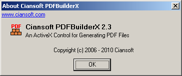 Ciansoft PDFBuilderX is an ActiveX (OCX) control that provides the capability to generate files in PDF format from within an application. Images, graphics and text can be included in the PDF document. Images to be added to the document can be read from files in many popular formats including BMP, TIF, JPG, GIF, PNG and others. Graphics can be created by drawing lines, rectangles, circles and ellipses in the document. Text can be written using a range of standard fonts or TrueType fonts available on your system. The user has full programmatic control over positioning and sizing of the images, graphics and text placed on the pages of the document. Text can be justified either left or right or centred. Automatic word-wrapping available. Hyperlinks can be added to text or images. Multiple page documents are supported, with no restrictions on mixing pages of different sizes. All page sizes are supported, either through customisation of width and height, or by selecting from a predefined list of standard sizes. Fonts can be embedded in the PDF file if required. A trial version of the control is available with full functionality. The only limitation of the trial is that a banner will be added on each page stating that trial software was used to create the PDF file.