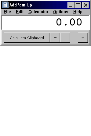 More than just a calculator! Add 'em Up can perform math calculations on data that resides on the Windows Clipboard. Although Add 'em Up can morph into a standard Desktop calculator with one press of the F9 key, it's uniqueness is in its ability to perform math calculations on data that resides on the Windows Clipboard. Let's say you are working in a spreadsheet, Microsoft's Excel, for instance. You have rows upon rows and columns upon columns of data, and you want to perform a math operation on just a select few cells in your spreadsheet. Simply select the cells you want to perform math operations on, then use the "Edit > Copy" (or CTRL+C) function in Excel, which will copy the cells to the Windows Clipboard. Once your selected data is on the Clipboard, then go to the Add 'em Up window (which can stay topmost and visible at all times) and click the "Calculator Clipboard" button. The data that had been copied to the Windows Clipboard is automatically pasted into the Add 'em Up number list. When the number list has been populated with numbers, you can then click on any row or column and perform math calculations on them. Numbers are automatically added, subtracted, multiplied or divided from each other. Handy for quick mathematical operations on groups of numbers.
